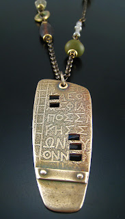 The writing on this pendant is from a tablet in the Louvre. I hand drew the tablet from a photo that I took and etched a copper sheet that I use for texture in the bronze clay. I started cutting windows out....I have no idea why...but it reminds me of the windows in a high rise building. It has both an ancient and modern look.